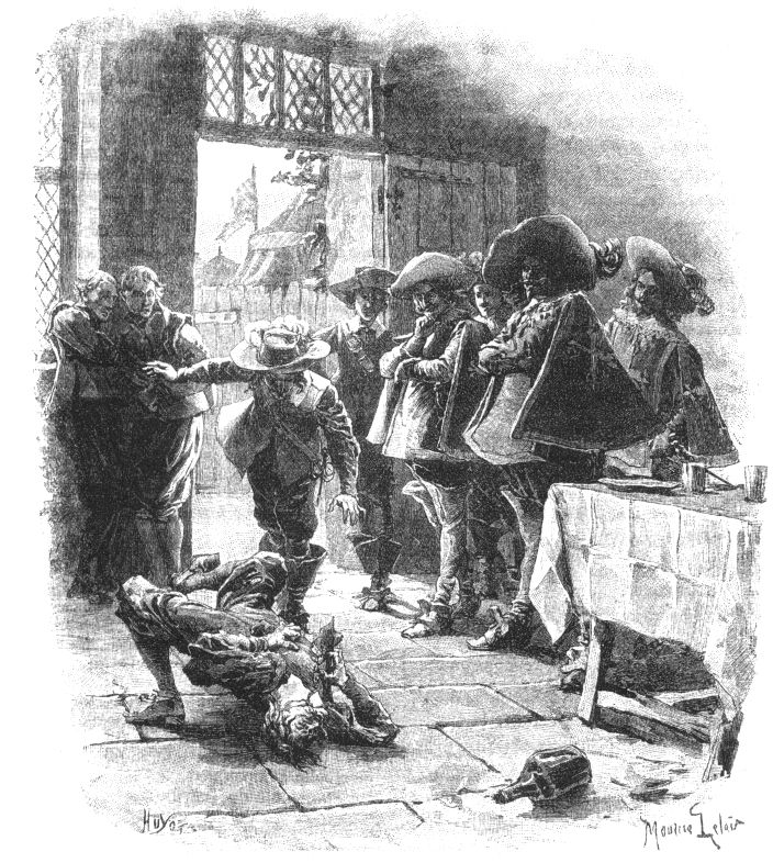 El club Philippe le Rouge está situado en una calle relativamente estrecha, pero a menos de treinta metros de la desembocadura de ésta en la Rue Saint Martin. Quizás por ello fue elegido por André du Guerrier y Jacques de la Touche para dirimir sus diferencias: frente a su puerta podían desarrollar el combate con ciertas apreturas pero, llegado el caso, podían buscar un espacio más amplio, aunque por supuesto manteniendo el ojo avizor por si aparecía una patrulla de la Guardia de la Vieille Cité. "Lo importante es saber escoger la hora", comentó André du Guerrier. De todas formas, la cosa fue rápida y no hubo incidencias relacionadas con las patrullas. Al segundo lance, Jacques de la Touche recibió un tajo de sable que dejó una mancha roja en su camisa. Ante la evidencia y siendo el duelo a primera sangre, el caballero se rindió. De todas formas, la herida revestía una cierta seriedad, y Jacques de la Touche empezó a dar síntomas de que iba a perder el conocimiento. Lo metieron en el club y lo tumbaron en un banco. Apareció entonces Ludovic Senneville, acompañado de un hombre de edad tirando a avanzada, cojo y con una cicatriz en la cara. Su aspecto provocó el recelo inicial de Jean-Pierre Montblanc-Duval, que hacía las veces de padrino del vencido, pero la seguridad y rapidez con la que taponó y vendó la herida sin decir una palabra, propia de alguien que ha hecho lo mismo muchas veces con anterioridad, despejó toda duda.