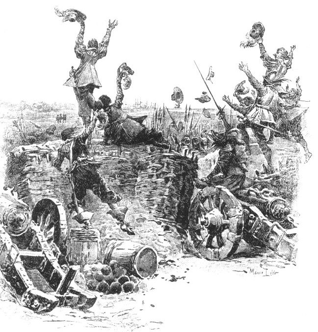 Al cabo de un rato, un pequeño carretón de mano empujado por un labriego apareció de no se sabe dónde y enfiló el sendero que llevaba a la colina. Los españoles que ocupaban la misma, prudentes, enviaron una patrulla a identificar al labriego y averiguar a dónde se dirigía. Sin embargo, el hombre, al ver a los jinetes soltó el carretón y huyó camino abajo como alma que lleva el diablo. La patrulla habría podido sin duda darle caza, pero la curiosidad pudo más. Descabalgaron, se acercaron al carretón y vieron que contenía un barril de vino. -¡Vaya! Parece que nos han dejado un regalo. Vamos a subirlo a la colina y así tendremos algo para acompañar la cena -dijeron. Ni cortos ni perezosos, ataron el carretón a los correajes de ambos caballos y, con una precaución infinita, lograron subirlo al puesto. Al mediodía siguiente, el coronel de los Dragones del Gran Duque Maximiliano de Valois no salía de su asombro. Una extraña bandera a cuadros blancos y rojos ondeaba en lo alto de la colina. Un sonriente Touril estaba a su lado. -Increíble, Mayor. Habéis ganado la apuesta, lo admito. Pero, ¿cómo...?-Bueno, mi Coronel. Lo más difícil ha sido conseguir el mantel, pero finalmente se pudo. El resto... Bueno, uno de mis hombres disfrazado de labriego, un barril de vino con unas hierbecitas disueltas, hierbecitas que mi abuela me daba de niño cuando no podía dormir... Y simplemente poner el barril en manos de esos borrachuzos sin que sospechasen nada. Luego, una incursión nocturna de una docena de hombres, rápida y letal, para pillarlos dormidos como bebés, y el resto ya lo podéis ver.