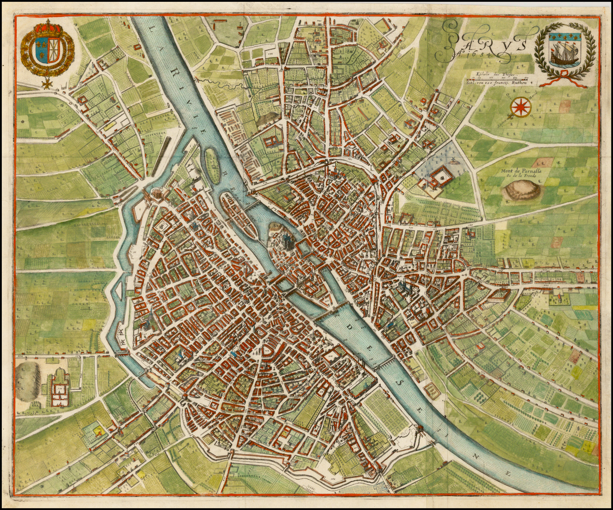 Transcurrió la velada con los recién llegados preguntando y el anfitrión respondiendo, hasta que éste tomó el rollo de papel, que aparentemente había quedado olvidado y, desatando el cordel, lo extendió sobre la mesa tras asegurarse de que estaba limpia. "Aquí tienen una pequeña maravilla que les será muy útil, mes amis. Es del año pasado, pero la Cité no ha cambiado tanto". Y expuso ante los asombrados ojos de el gascón y François de Hadoque nada menos que el plano de Merian, publicado hace menos de un año. Además, dos copias, una para cada uno. Ni uno ni otro conocían la existencia de un plano tan detallado, ni podían imaginar que fuera posible tal nivel de detalle. Un regalo de bienvenida excelente, sin duda...