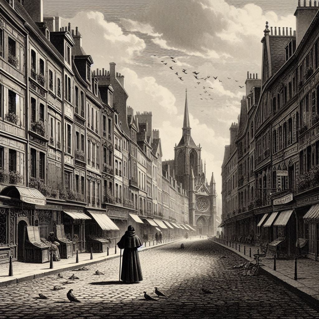 Fray Marcel, en su túnica marrón, avanzaba lentamente por esas calles silenciosas, observando atentamente los cambios. Su mirada se posaba en las construcciones medievales, ahora con sus puertas y ventanas cerradas, en los adoquines desgastados por el constante pisar de los parisinos y en la basílica de Notre Dame, que aparecía como un faro solitario en el horizonte urbano, sin su habitual cúmulo de feligreses y peregrinos.