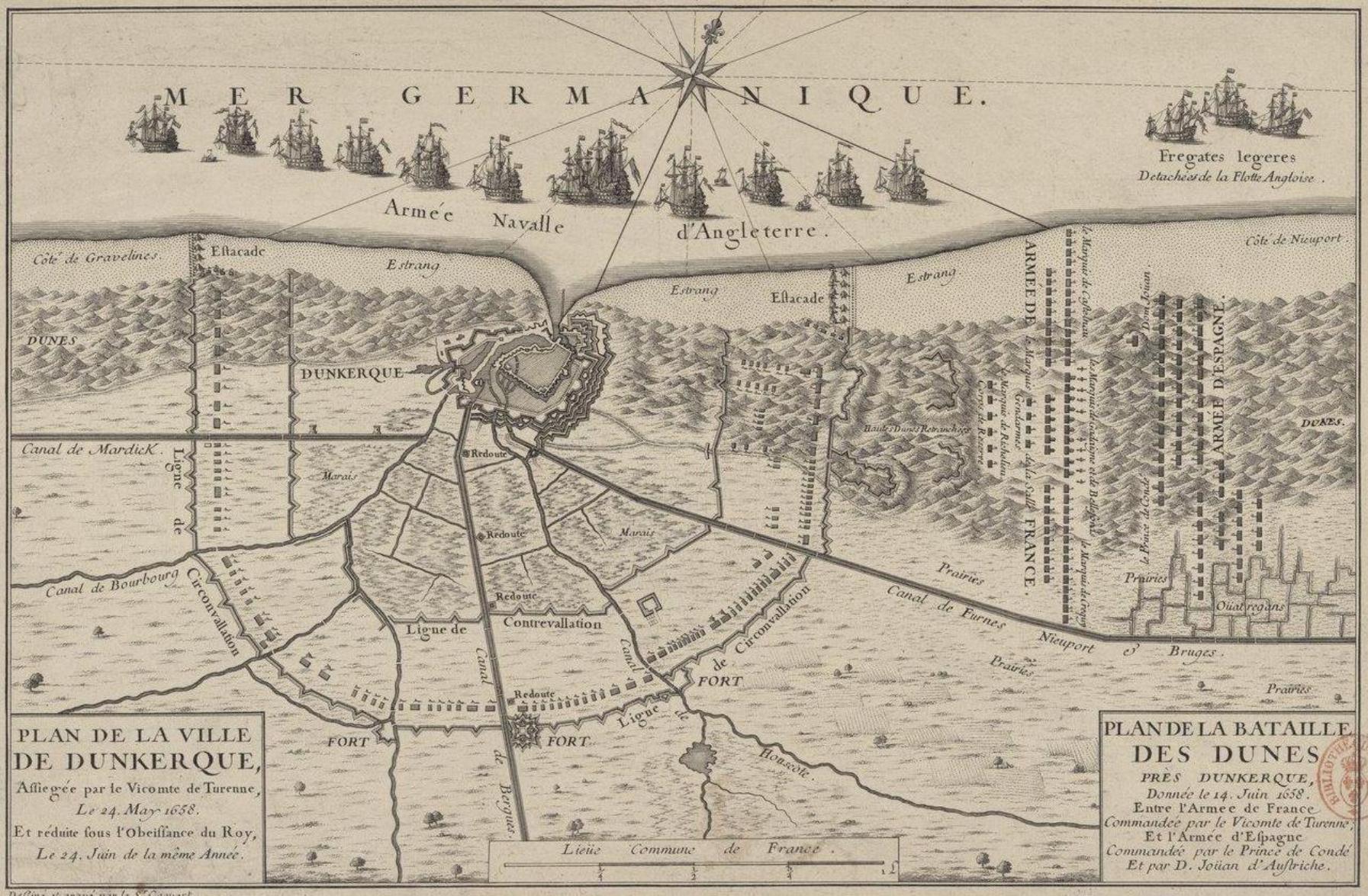 En lo alto de una duna no muy alejada de las posiciones de Dunkerque, fuera del alcance de la artillería, se distingue un pequeño grupo de figuras. A sus pies, un gigantesco campamento, con innúmeras tiendas de campaña, tropas y caballos.