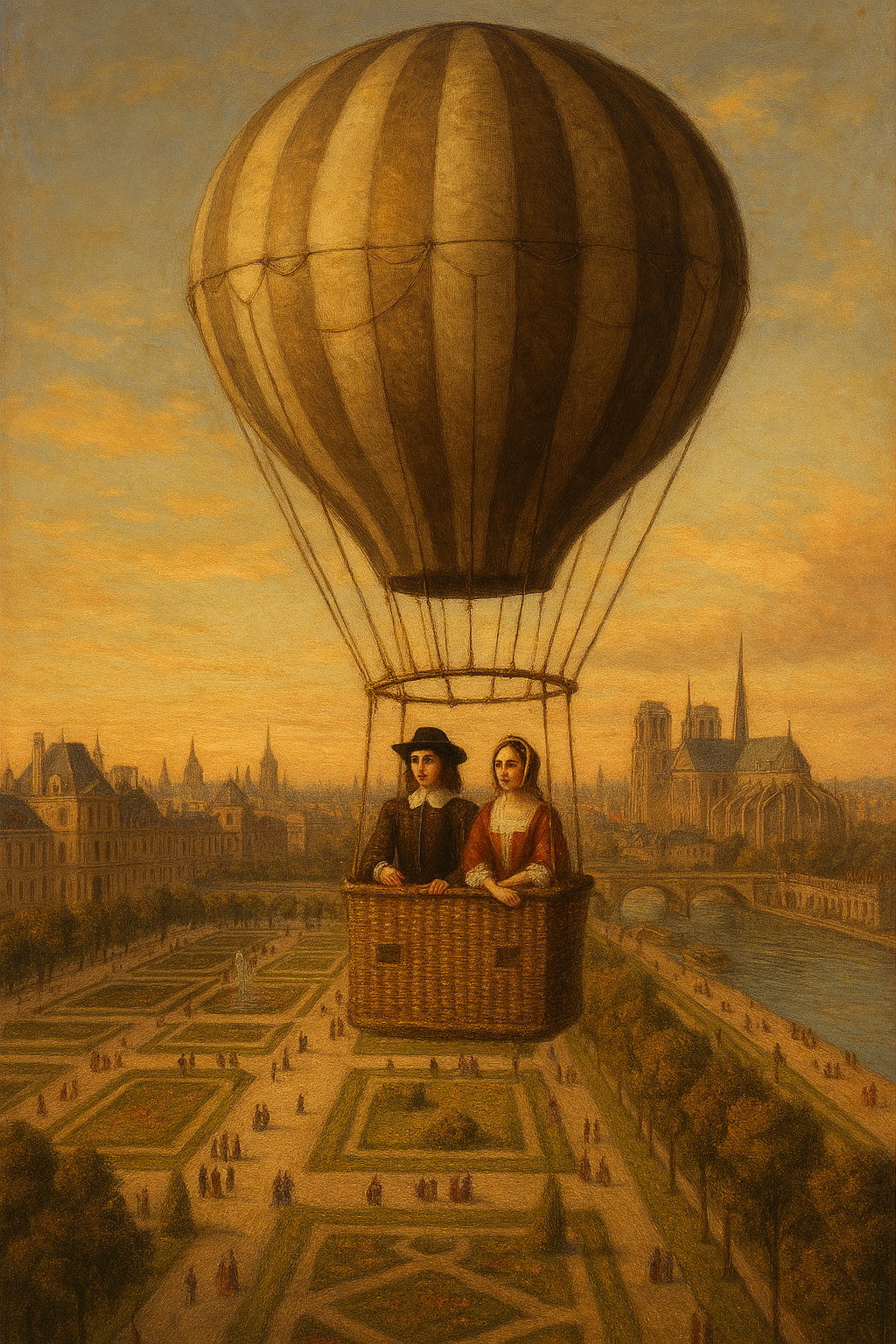 Violette Fablet estaba disfrutando del buen tiempo que todavía reinaba en estos últimos días de verano. Paseaba tranquilamente por el parque de les Tuileries cuando un extraño sonido le hizo levantar la cabeza. Era... Algo entre un órgano de iglesia y unas voces celestiales. Al alzar la vista quedó momentáneamente cegada por el sol de la tarde, así que con un grácil movimiento interpuso la sombrilla entre sus ojos y el astro rey. Entonces pudo verlo: era un... ingenio, una especie de cesta sujeta por una gran masa de tela hinchada; de ella sobresalían unos tubos metálicos que eran los que producían el peculiar sonido al pasar la brisa por ellos. El aparato descendía grácilmente del cielo y acabó posándose en una pequeña loma cercana; de la barquilla descendió un caballero que se acercó a ella y, con una sonrisa y una genuflexión, le ofreció su mano para que la tomara. Fue entonces cuando Violette reconoció a Hermeto Cornamusa.